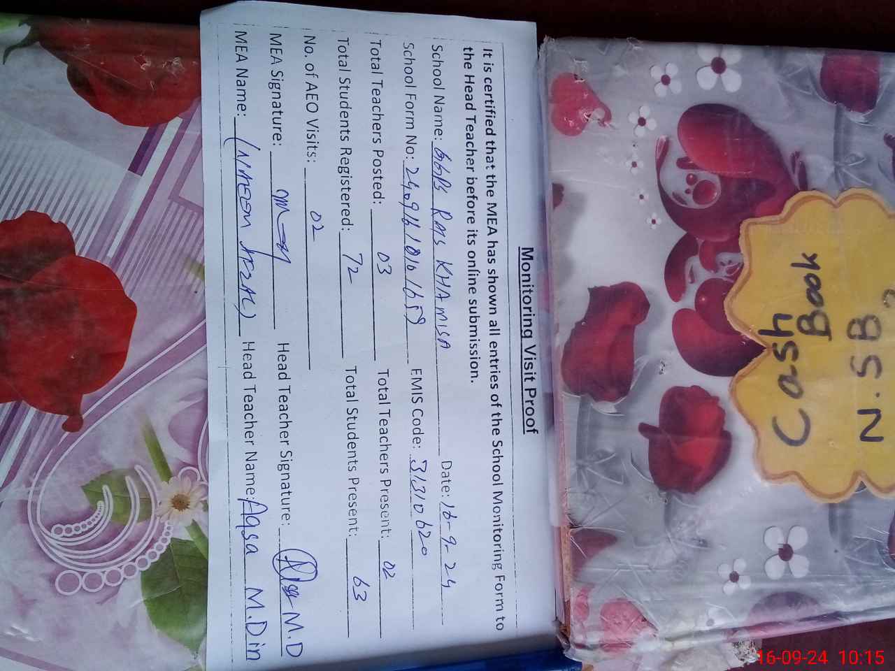 | Attendance Register | Head Teacher | MEA with School | Visit Proof |