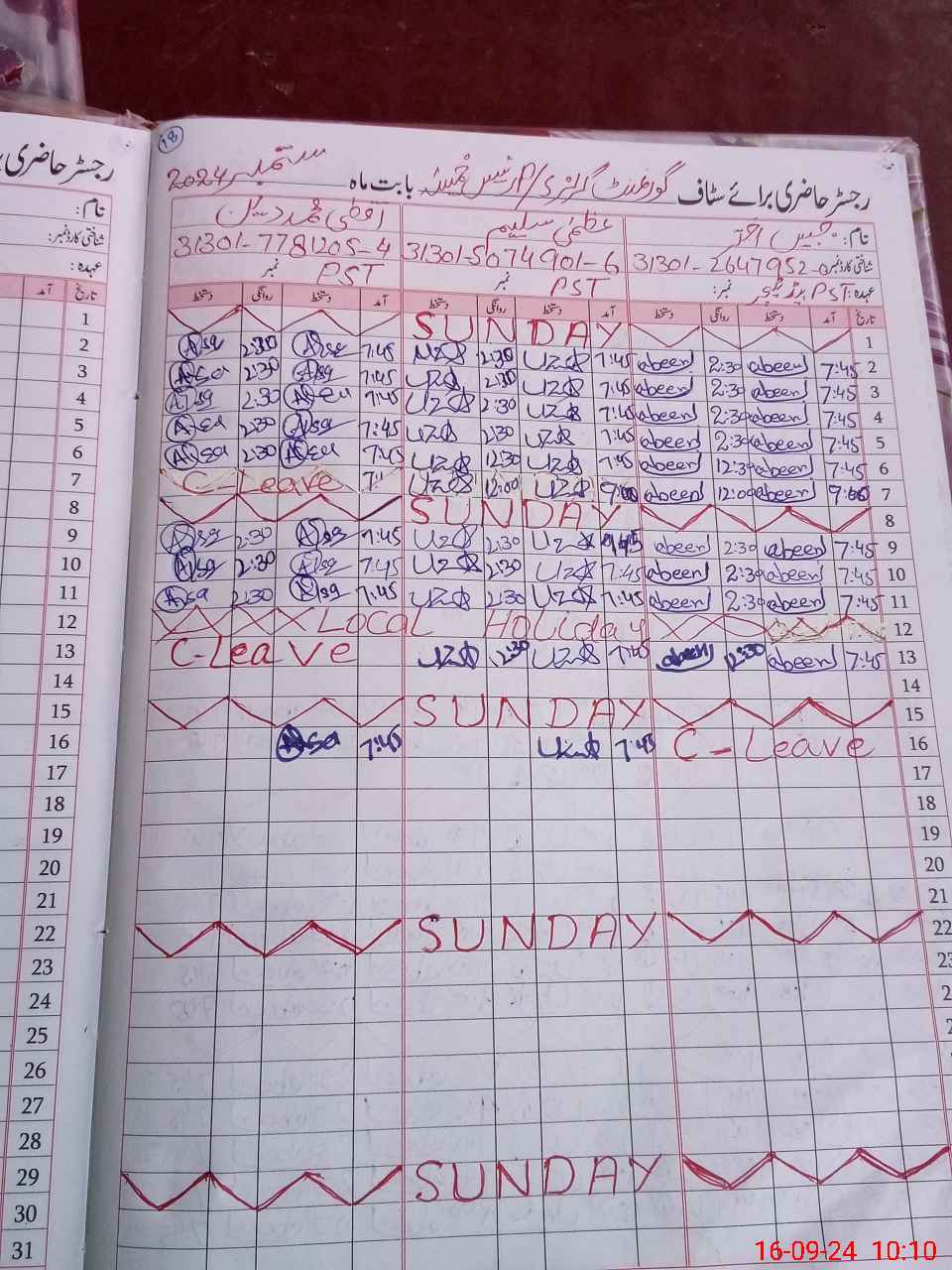| CNIC | Full Name | Designation | R/C | Absence during last cal. month |