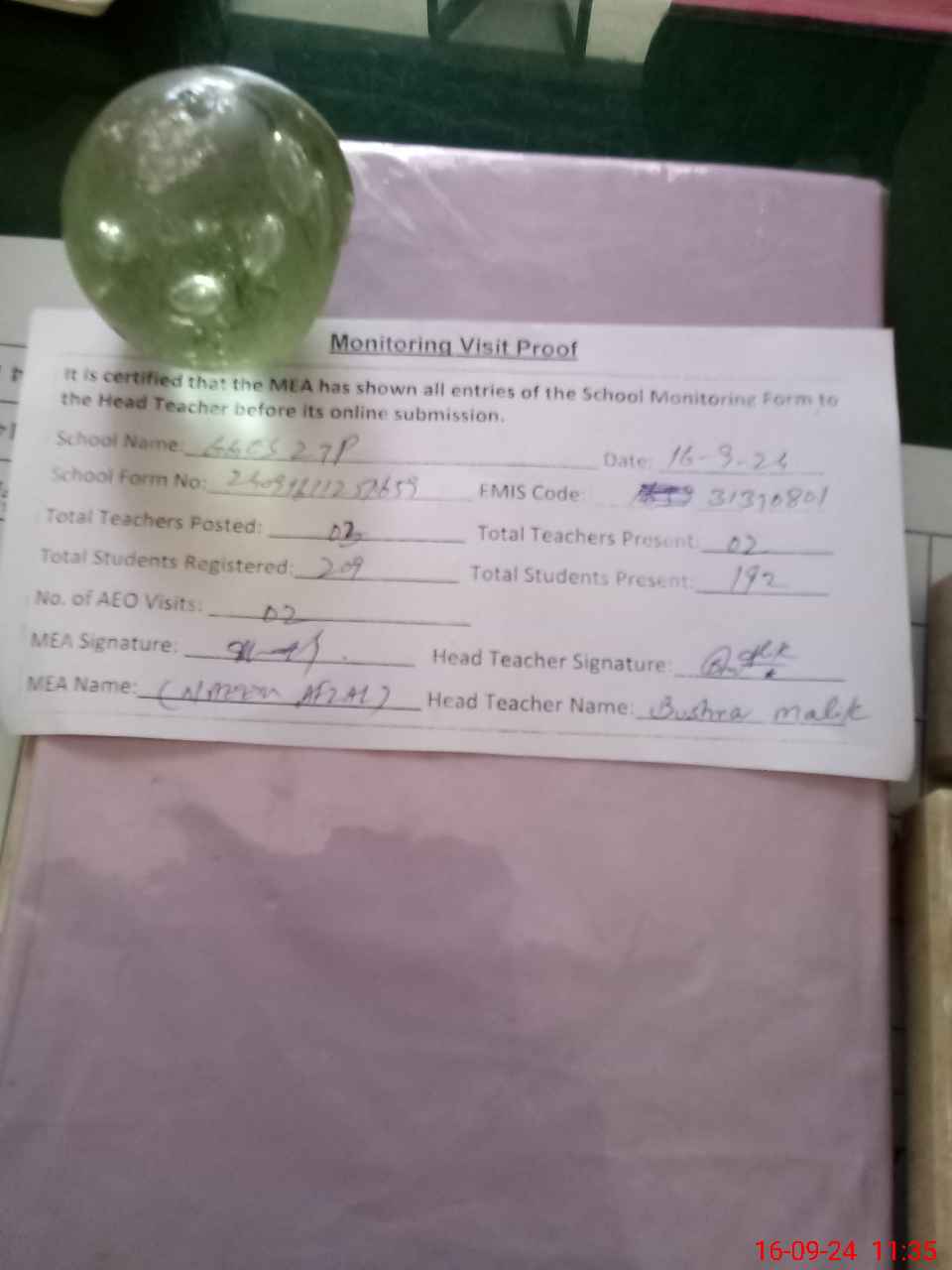| Certified that this School was Inspected by the Undersigned MEA/DMO Today and the Information Stated Above is as Per Record. | |||||
