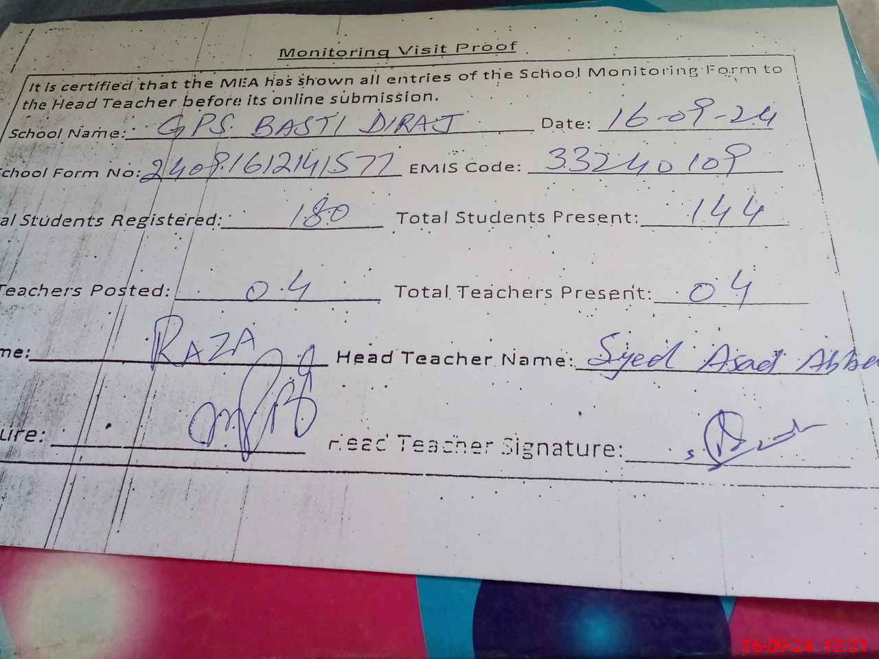 | Attendance Register | Head Teacher | MEA with School | Visit Proof |