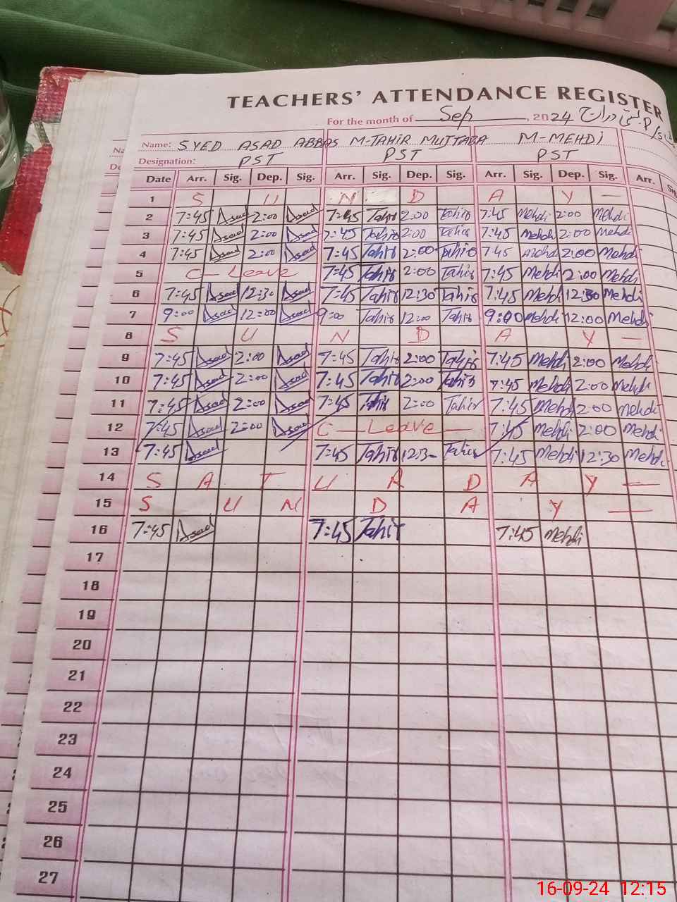 | CNIC | Full Name | Designation | R/C | Absence During Last Calender Month |
