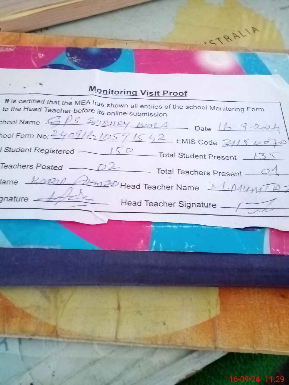 | EMIS Code: 31150070 | Name of School: GPS SOBHEY WALA | |||