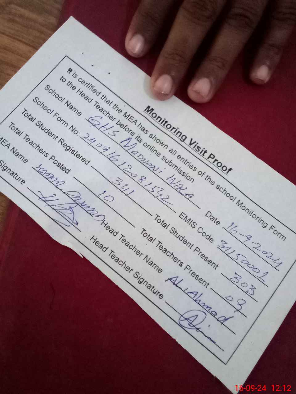 | Attendance Register | Head Teacher | MEA with School | Visit Proof |