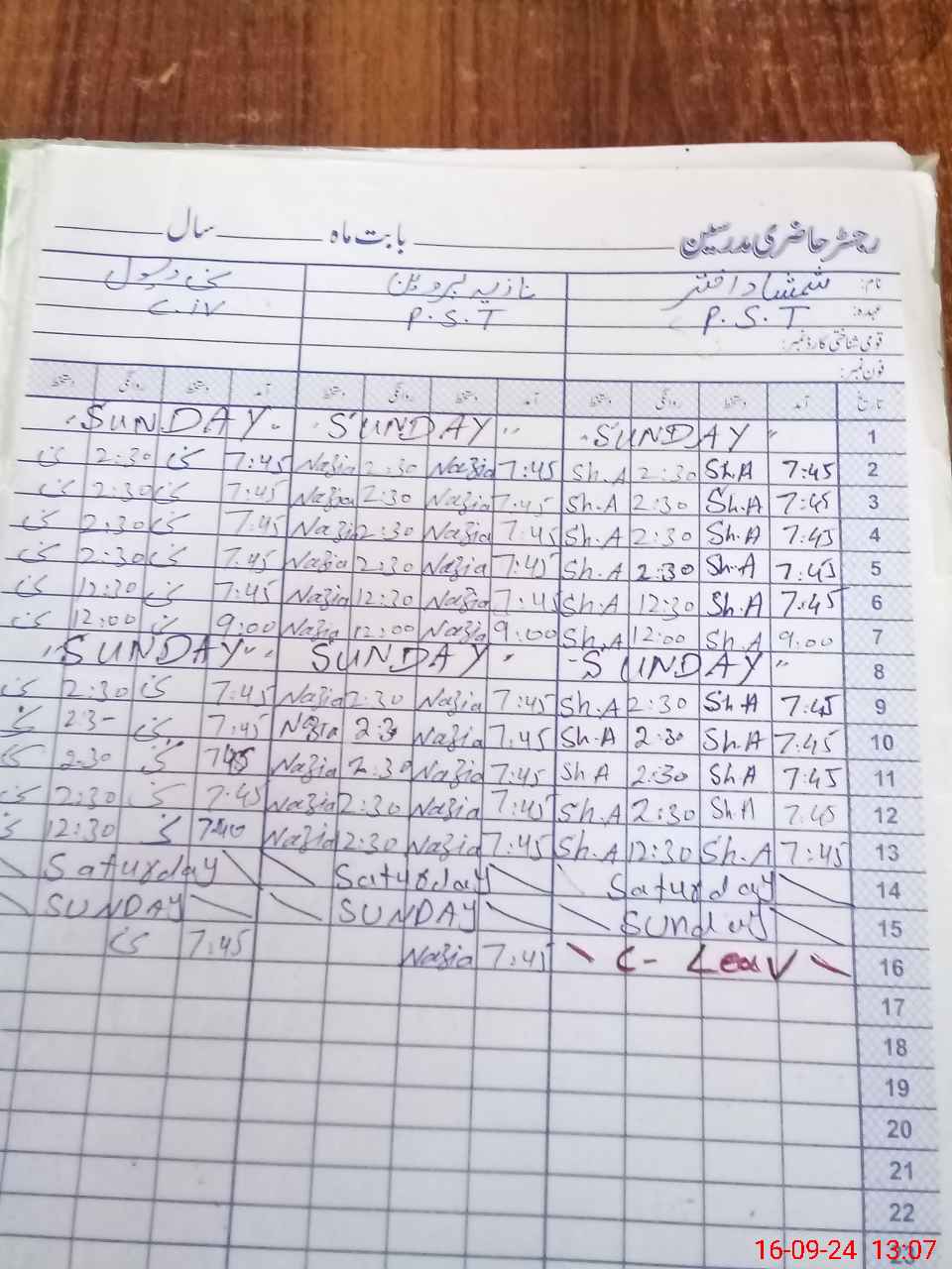 | CNIC | Full Name | Designation | R/C | Absence During Last Calender Month |