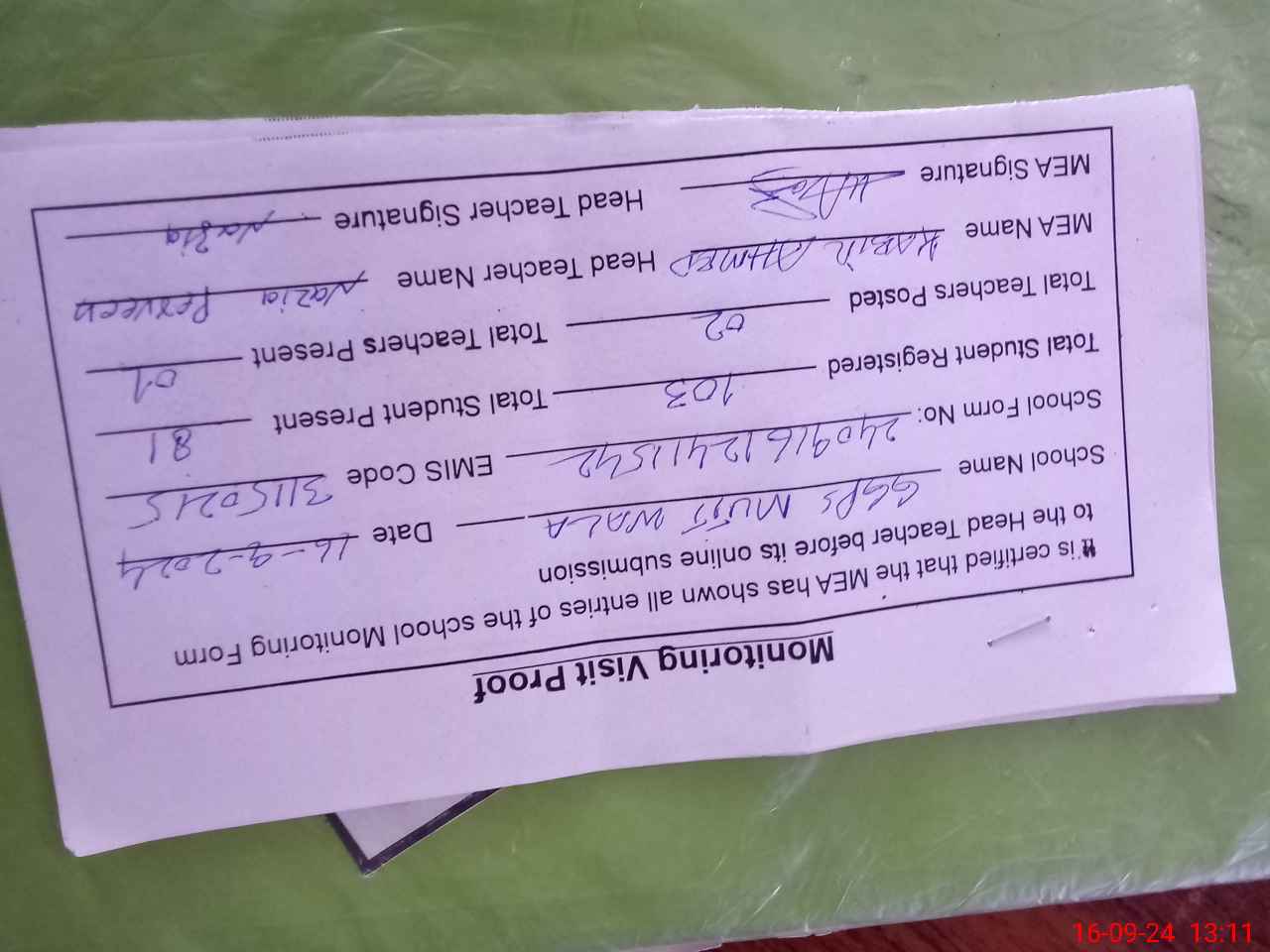 | Attendance Register | Head Teacher | MEA with School | Visit Proof |