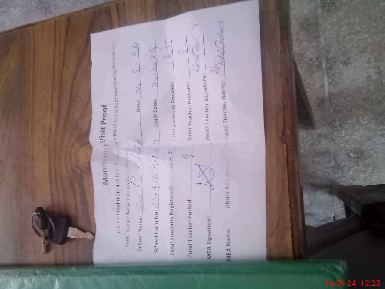 | Attendance Register | Head Teacher | MEA with School | Visit Proof |