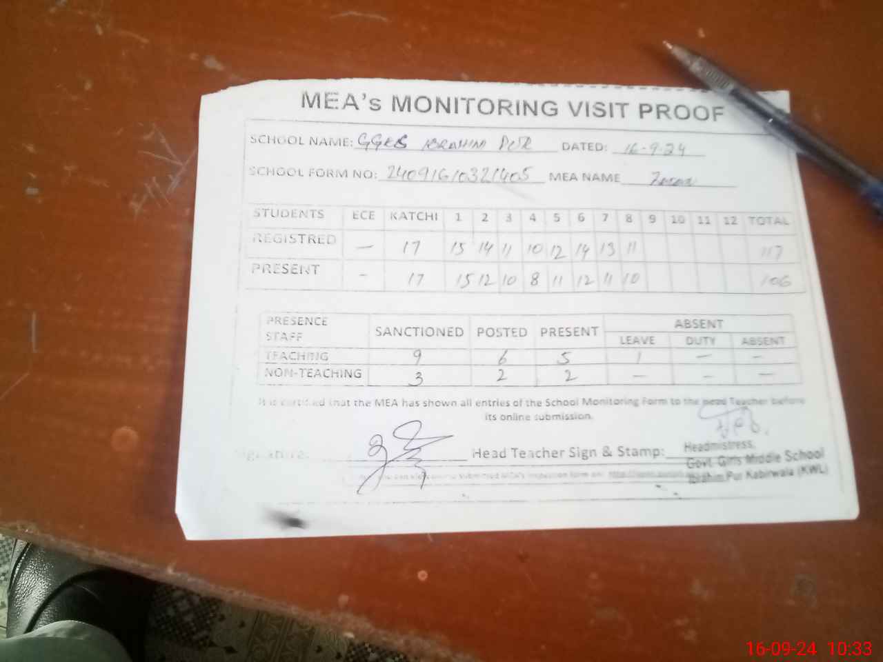 | Attendance Register | Head Teacher | MEA with School | Visit Proof |