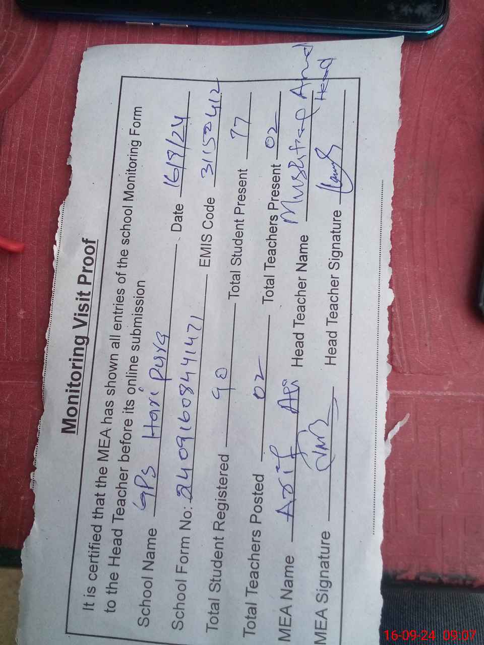 | Attendance Register | Head Teacher | MEA with School | Visit Proof |