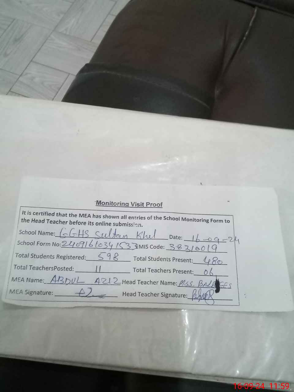 | EMIS Code: 38310019 | Name of School: GGHS SULTAN KHEL | |||