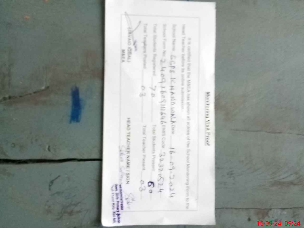 | Attendance Register | Head Teacher | MEA with School | Visit Proof |