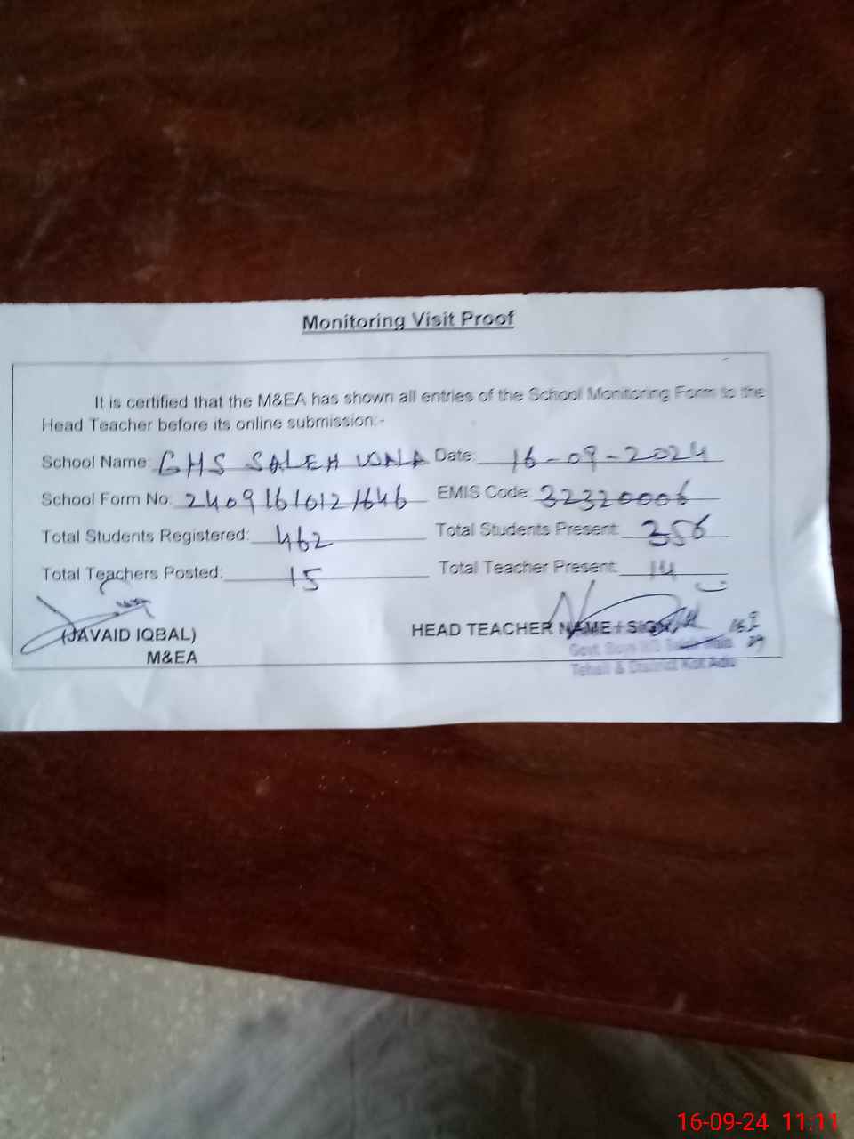 | Attendance Register | Head Teacher | MEA with School | Visit Proof |