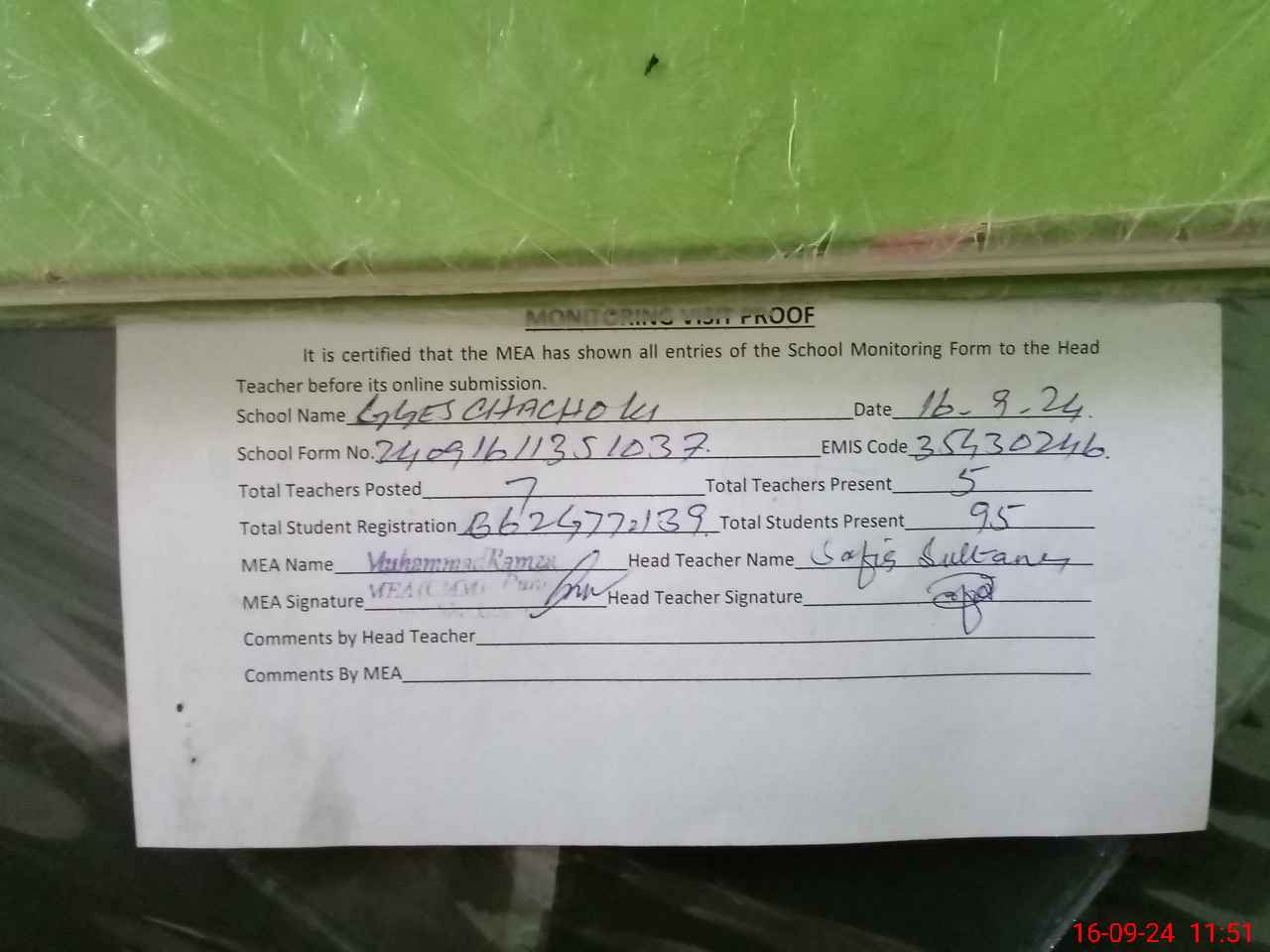 | Attendance Register | Head Teacher | MEA with School | Visit Proof |