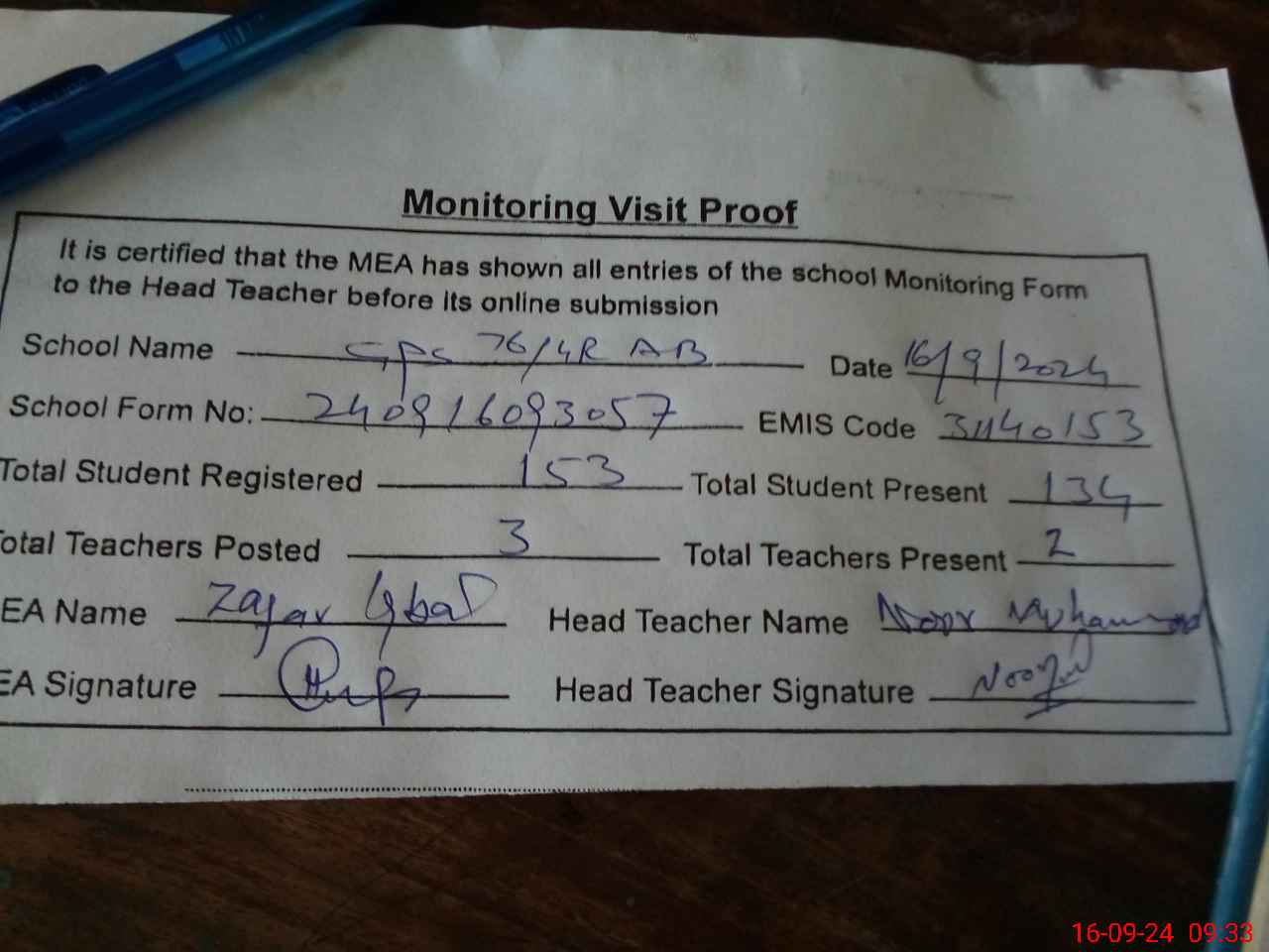 | Attendance Register | Head Teacher | MEA with School | Visit Proof |