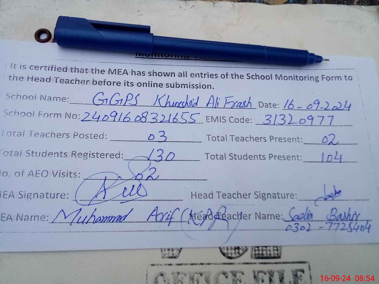 | EMIS Code: 31320977 | Name of School: GGPS KHURSHID ALI FRASH | |||