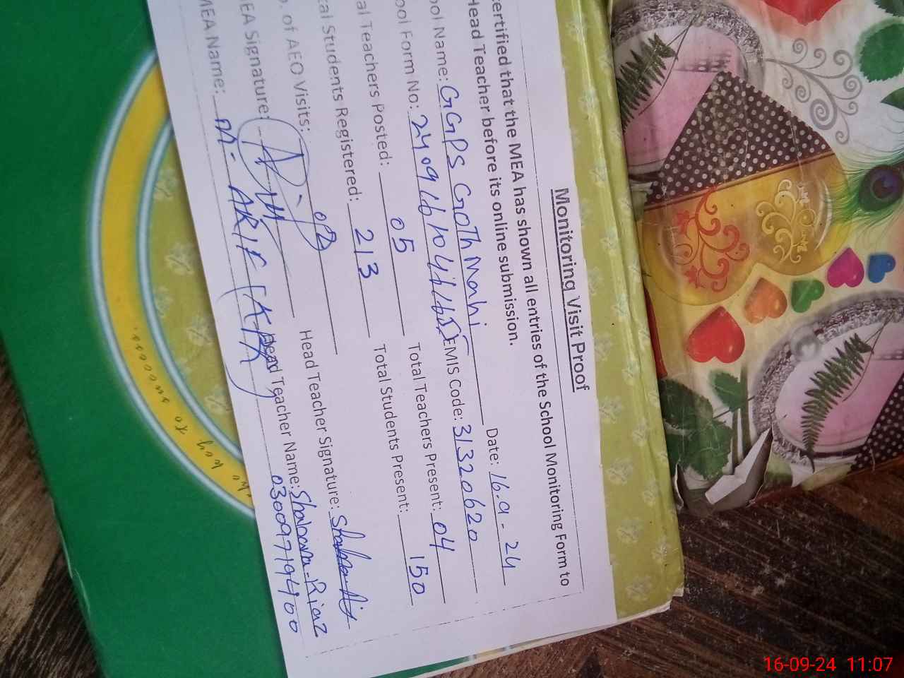 | Attendance Register | Head Teacher | MEA with School | Visit Proof |