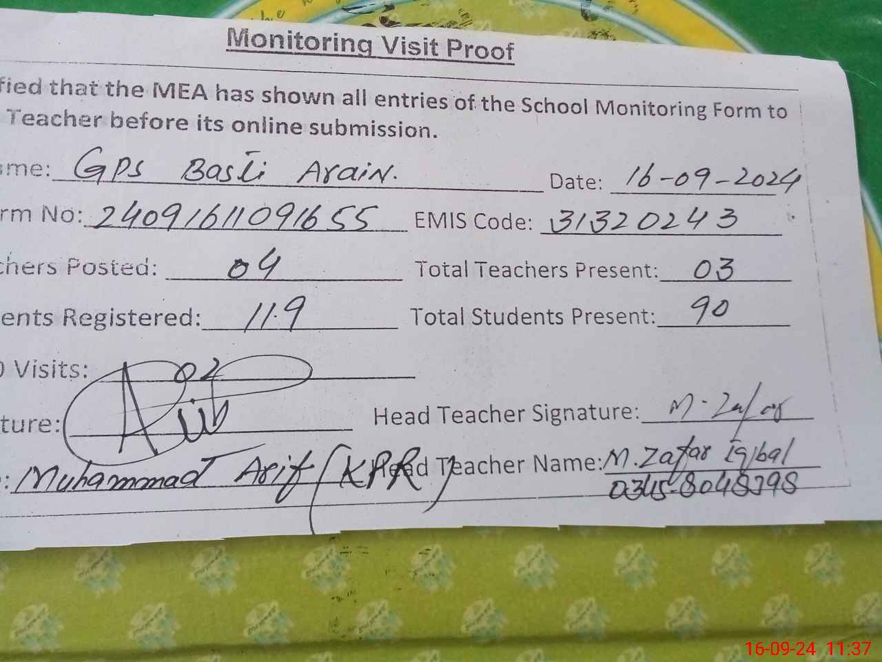| EMIS Code: 31320243 | Name of School: GPS BASTI ARAIN | |||