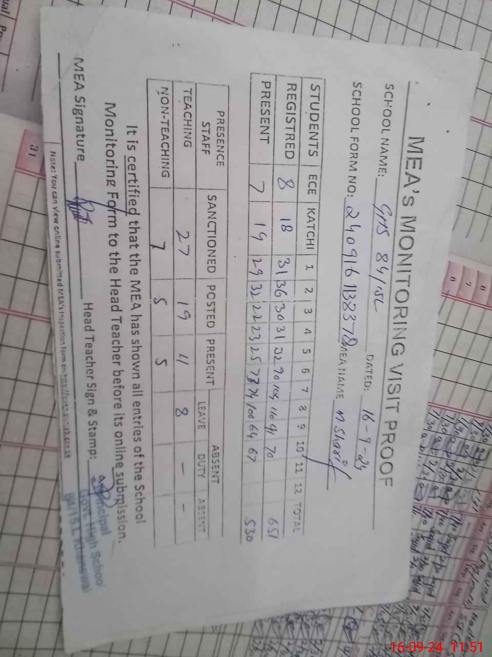 | Attendance Register | Head Teacher | MEA with School | Visit Proof |