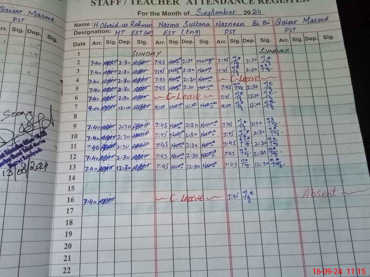 | CNIC | Full Name | Designation | R/C | Absence During Last Calender Month |