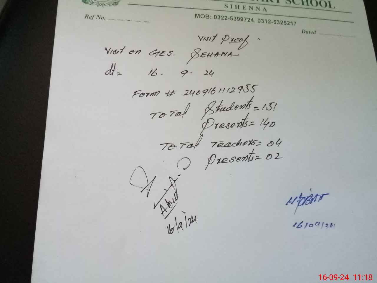 | Attendance Register | Head Teacher | MEA with School | Visit Proof |
