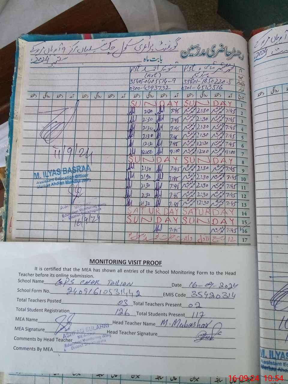 | Attendance Register | Head Teacher | MEA with School | Visit Proof |