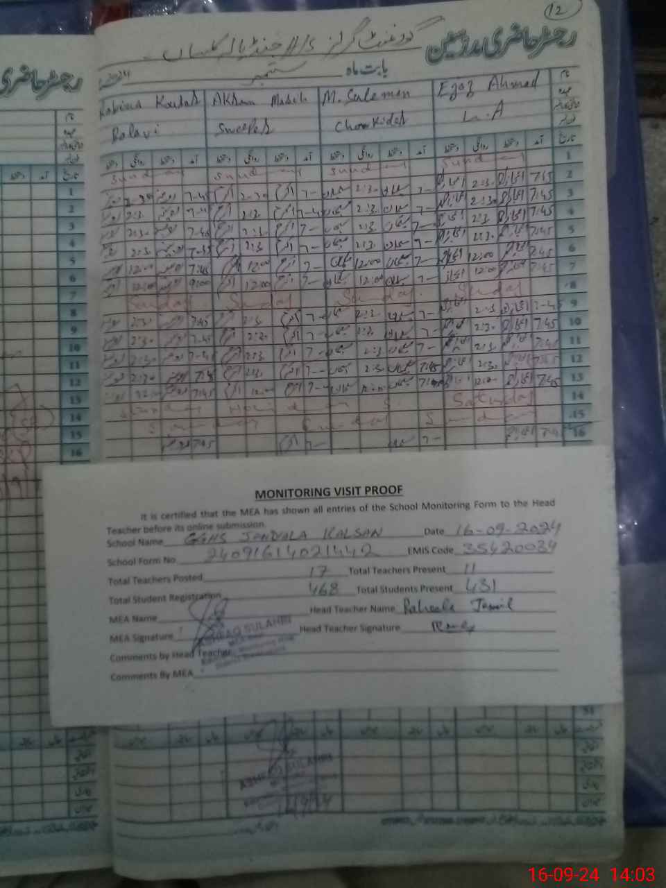 | Attendance Register | Head Teacher | MEA with School | Visit Proof |