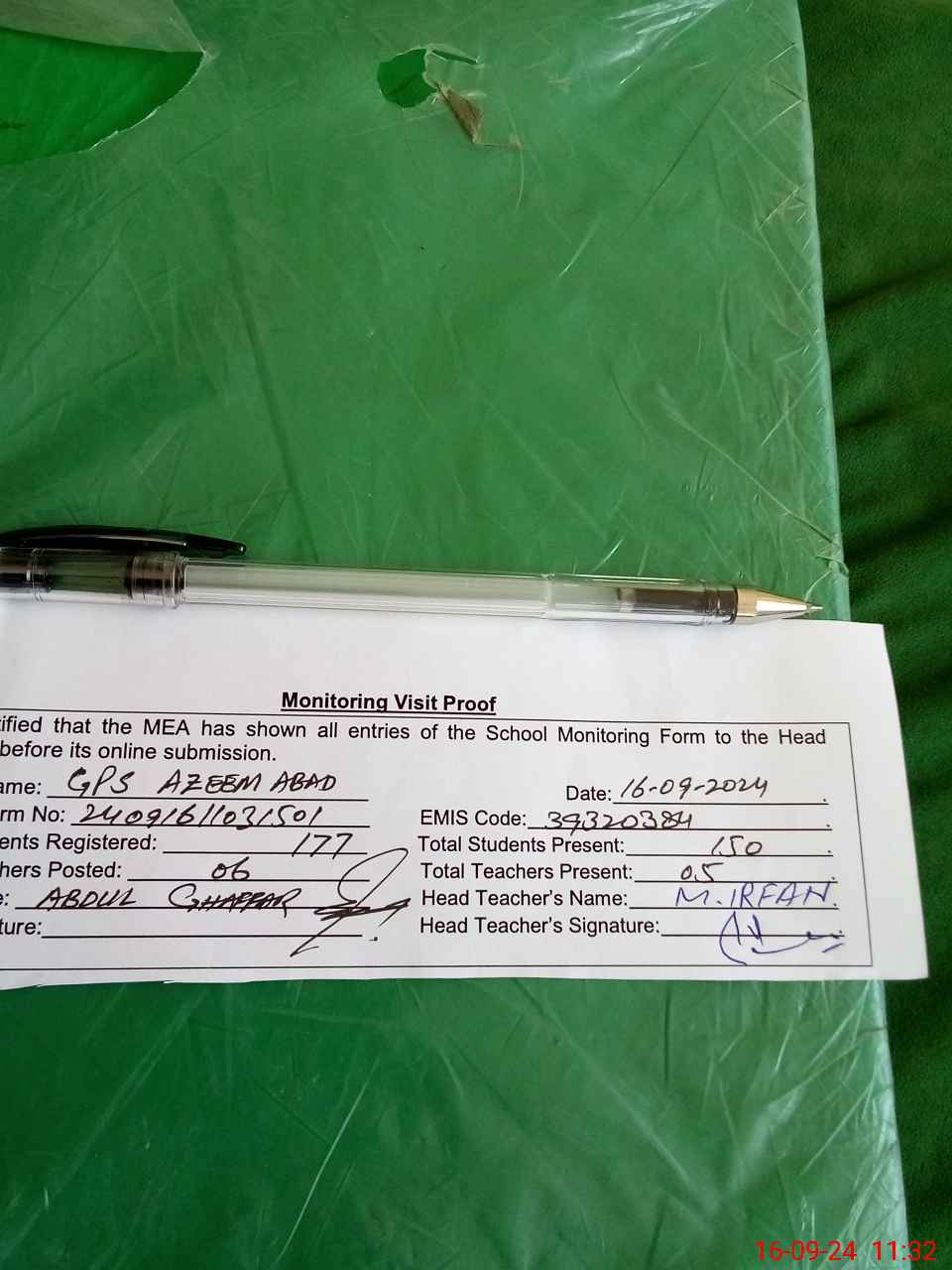 | Attendance Register | Head Teacher | MEA with School | Visit Proof |