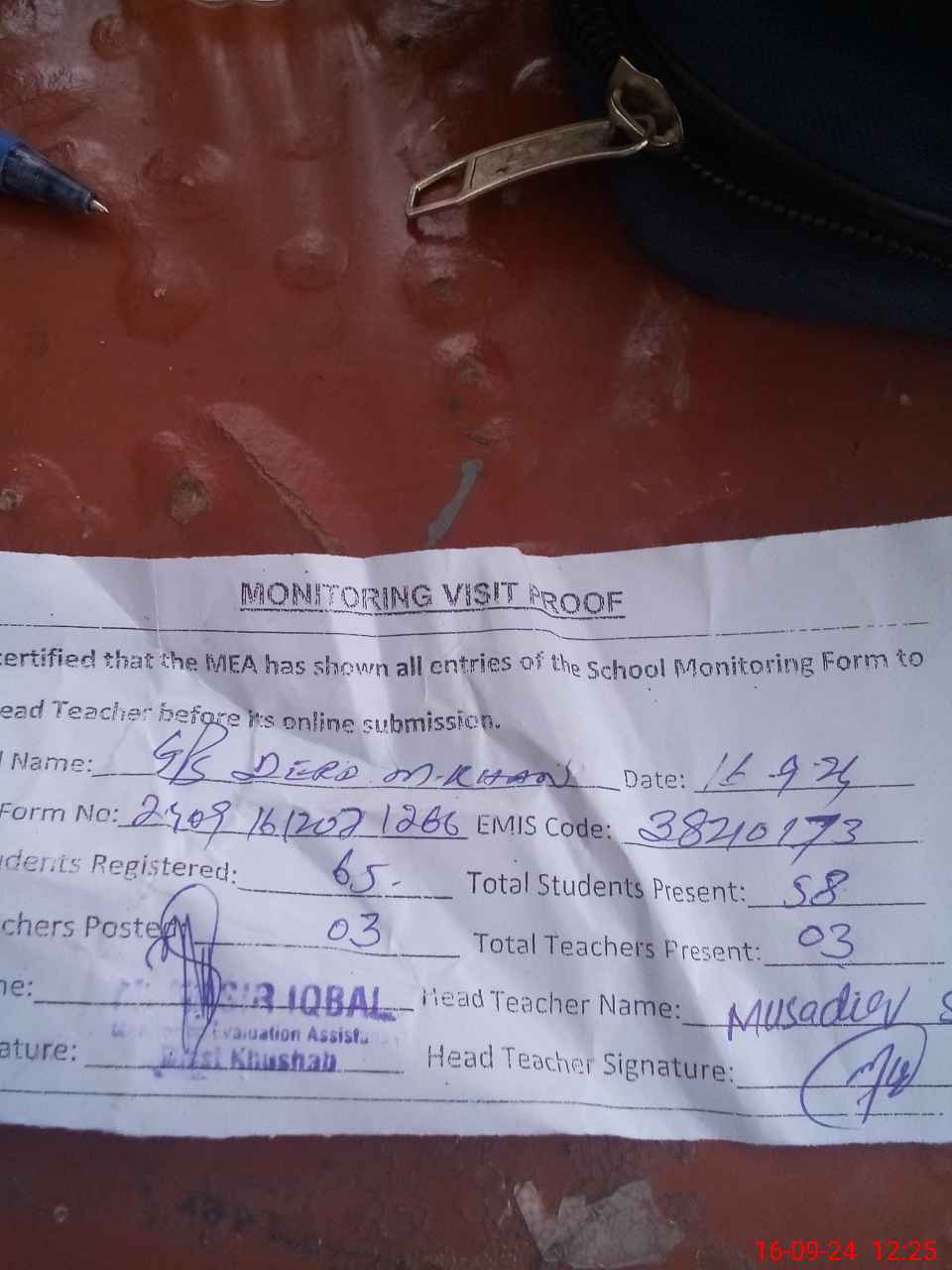 | Attendance Register | Head Teacher | MEA with School | Visit Proof |