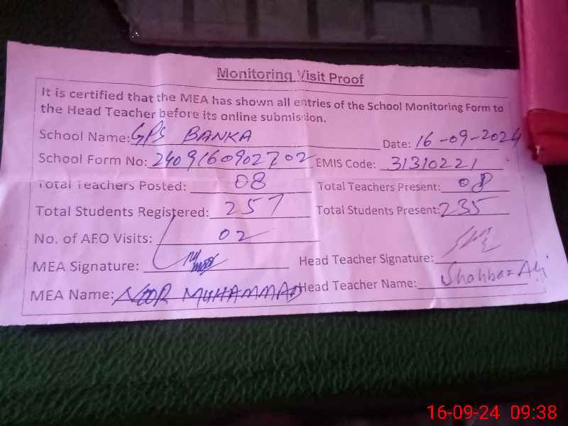 | EMIS Code: 31310221 | Name of School: GPS BANKA (After Noon) | |||