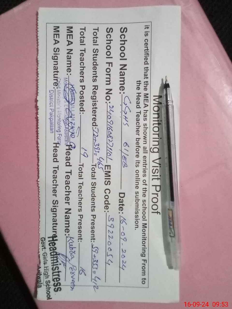 | Certified that this School was Inspected by the Undersigned MEA/DMO Today and the Information Stated Above is as Per Record. | |||||