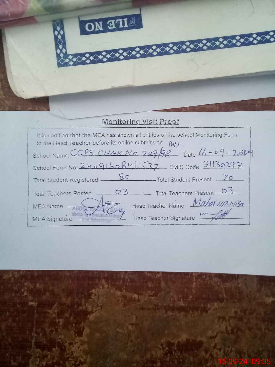 | Attendance Register | Head Teacher | MEA with School | Visit Proof |