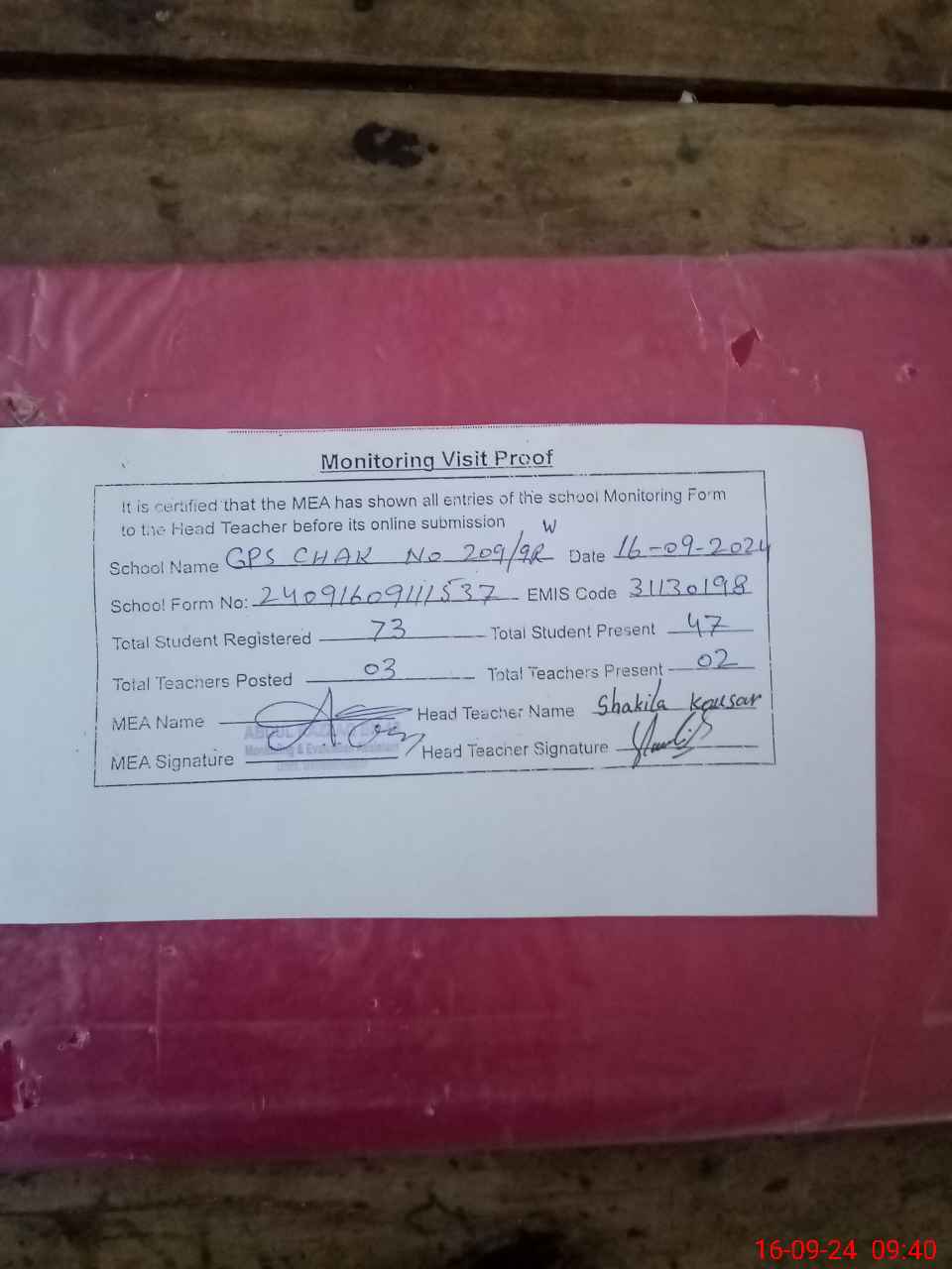| EMIS Code: 31130198 | Name of School: GPS CHAK 209/9-R WEST | |||