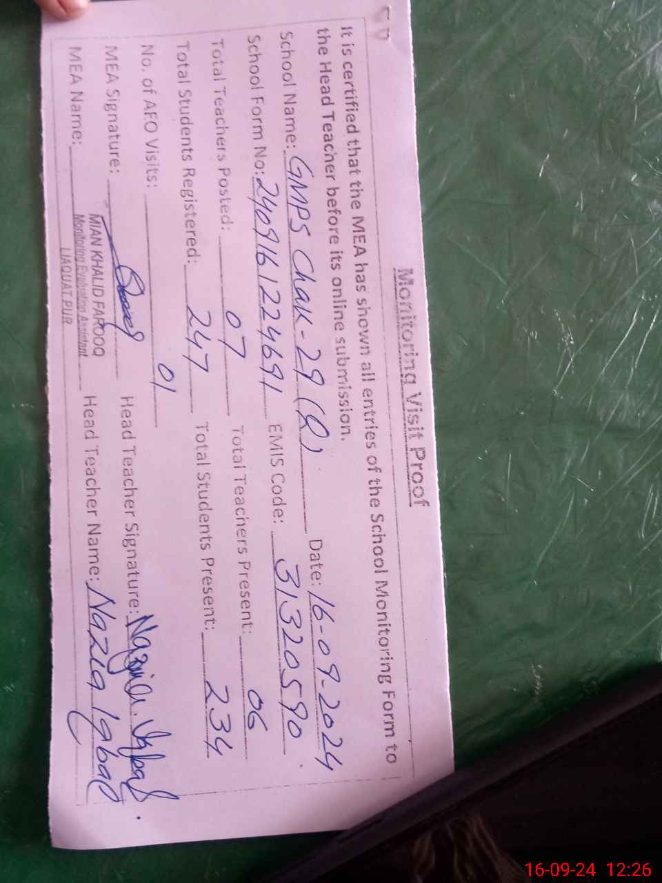 | EMIS Code: 31320590 | Name of School: GMPS CHAK NO.29 QADEEM | |||