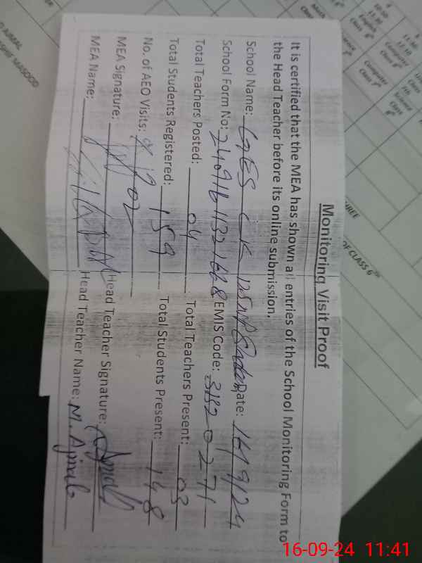 | Certified that this School was Inspected by the Undersigned MEA/DMO Today and the Information Stated Above is as Per Record. | |||||