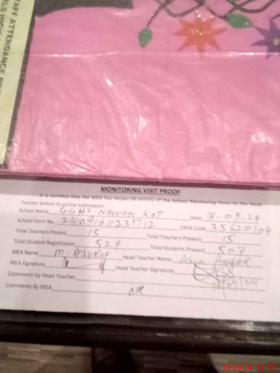 | Attendance Register | Head Teacher | MEA with School | Visit Proof |