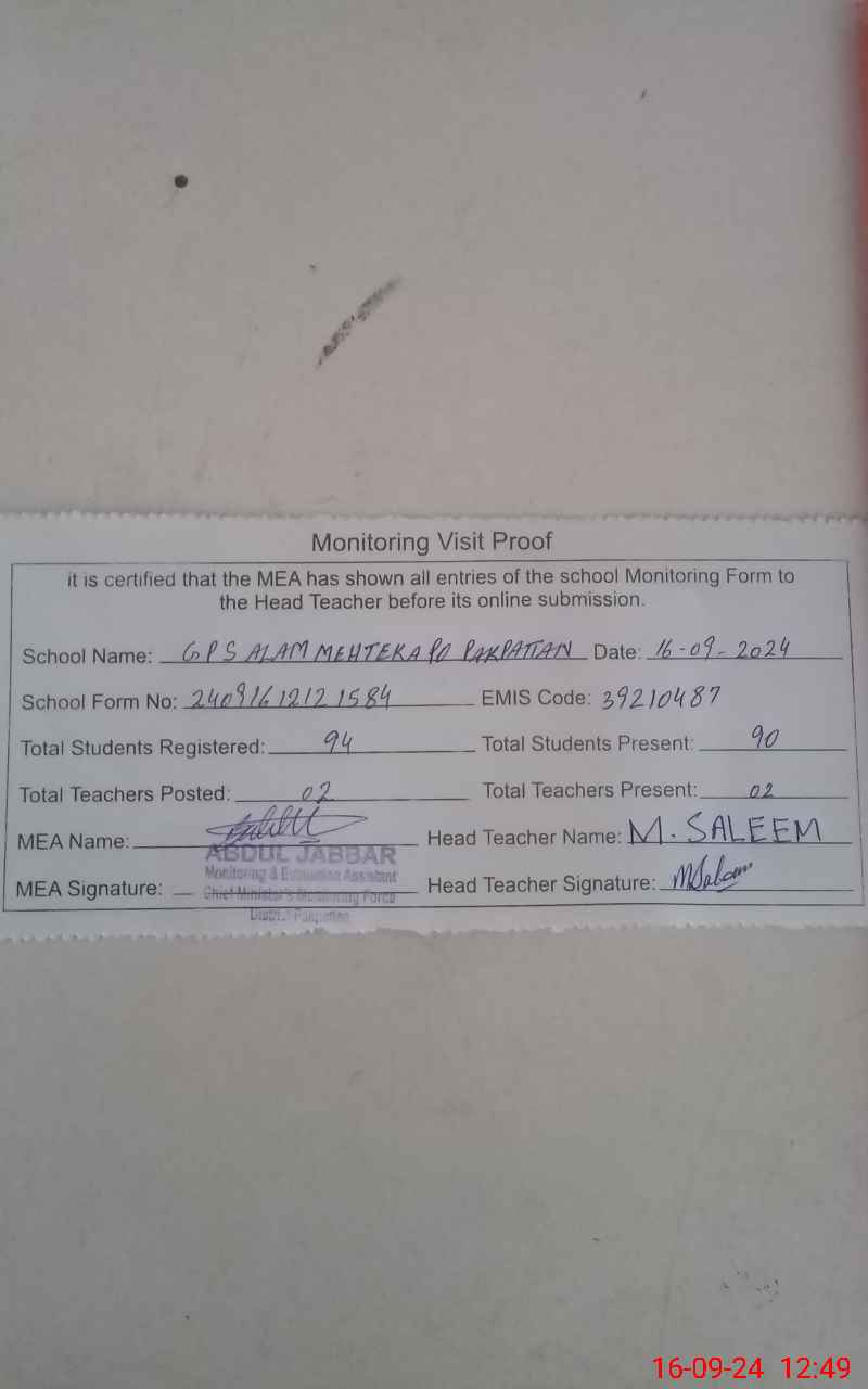 | EMIS Code: 39210487 | Name of School: GPS ALAM MEHTEKA PO PAKPATTAN | |||