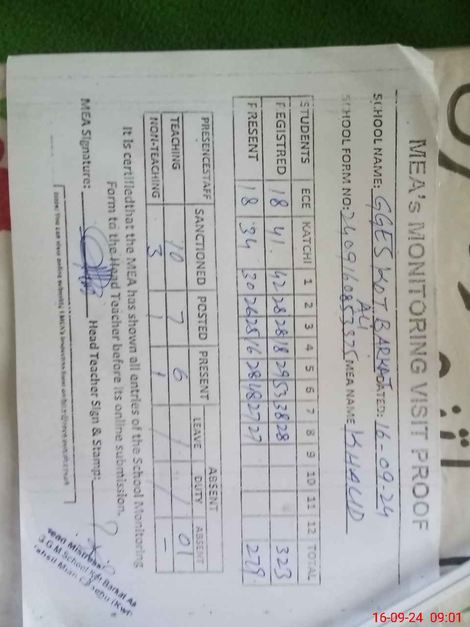 | Attendance Register | Head Teacher | MEA with School | Visit Proof |
