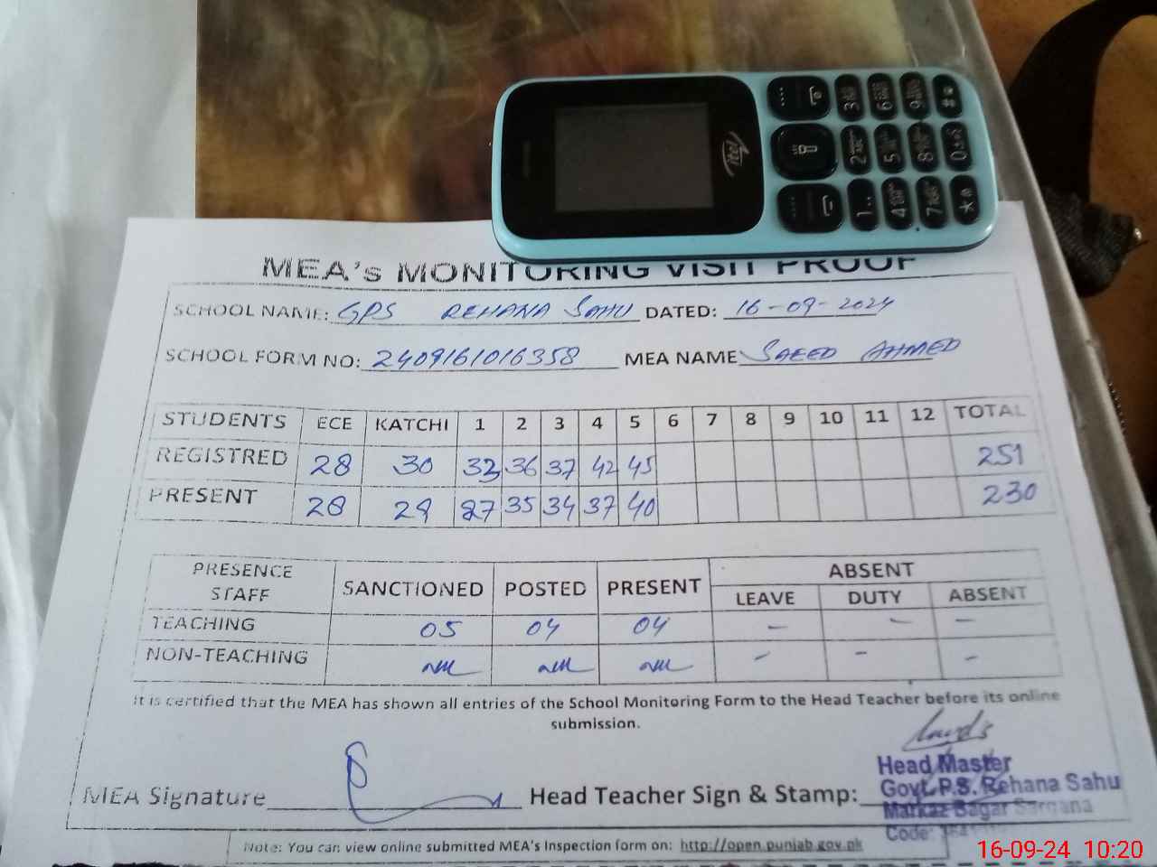 | Attendance Register | Head Teacher | MEA with School | Visit Proof |