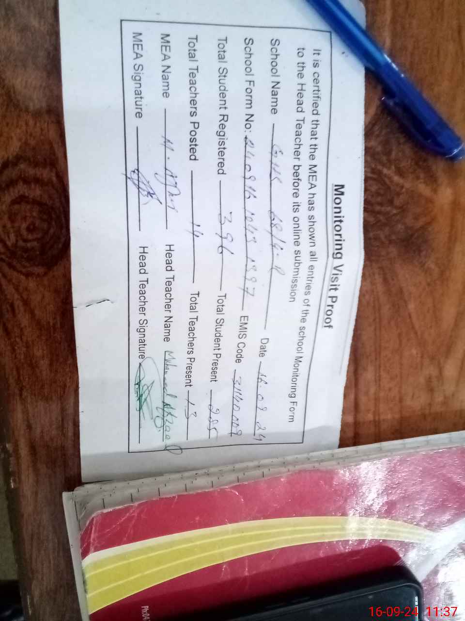 | Attendance Register | Head Teacher | MEA with School | Visit Proof |