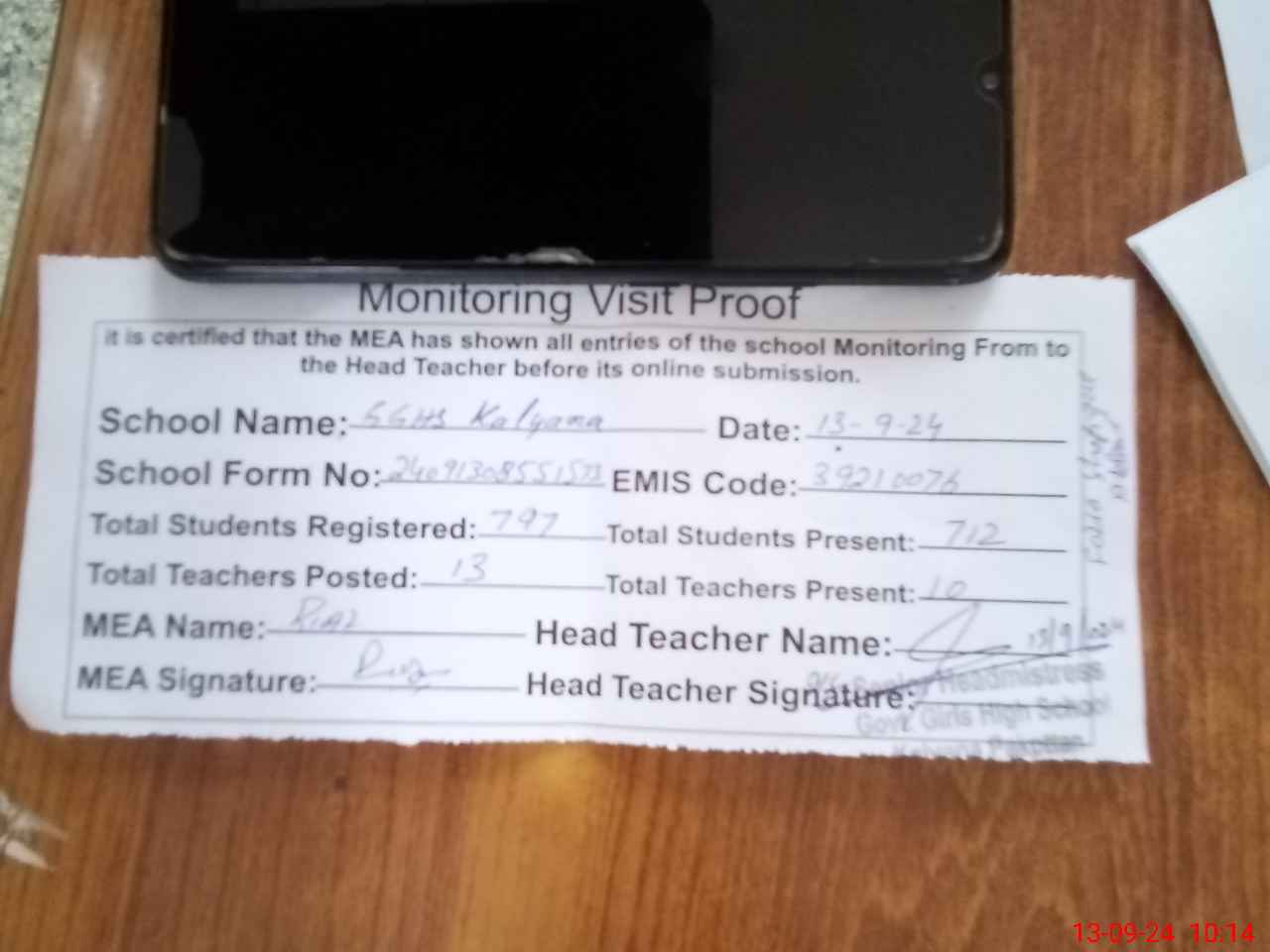 | Attendance Register | Head Teacher | MEA with School | Visit Proof |