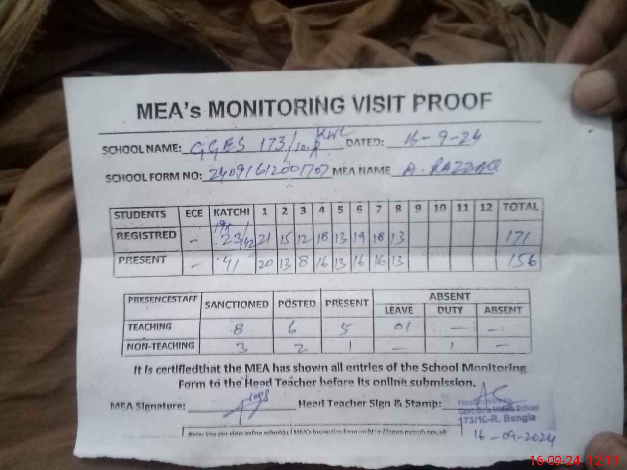 | Attendance Register | Head Teacher | MEA with School | Visit Proof |