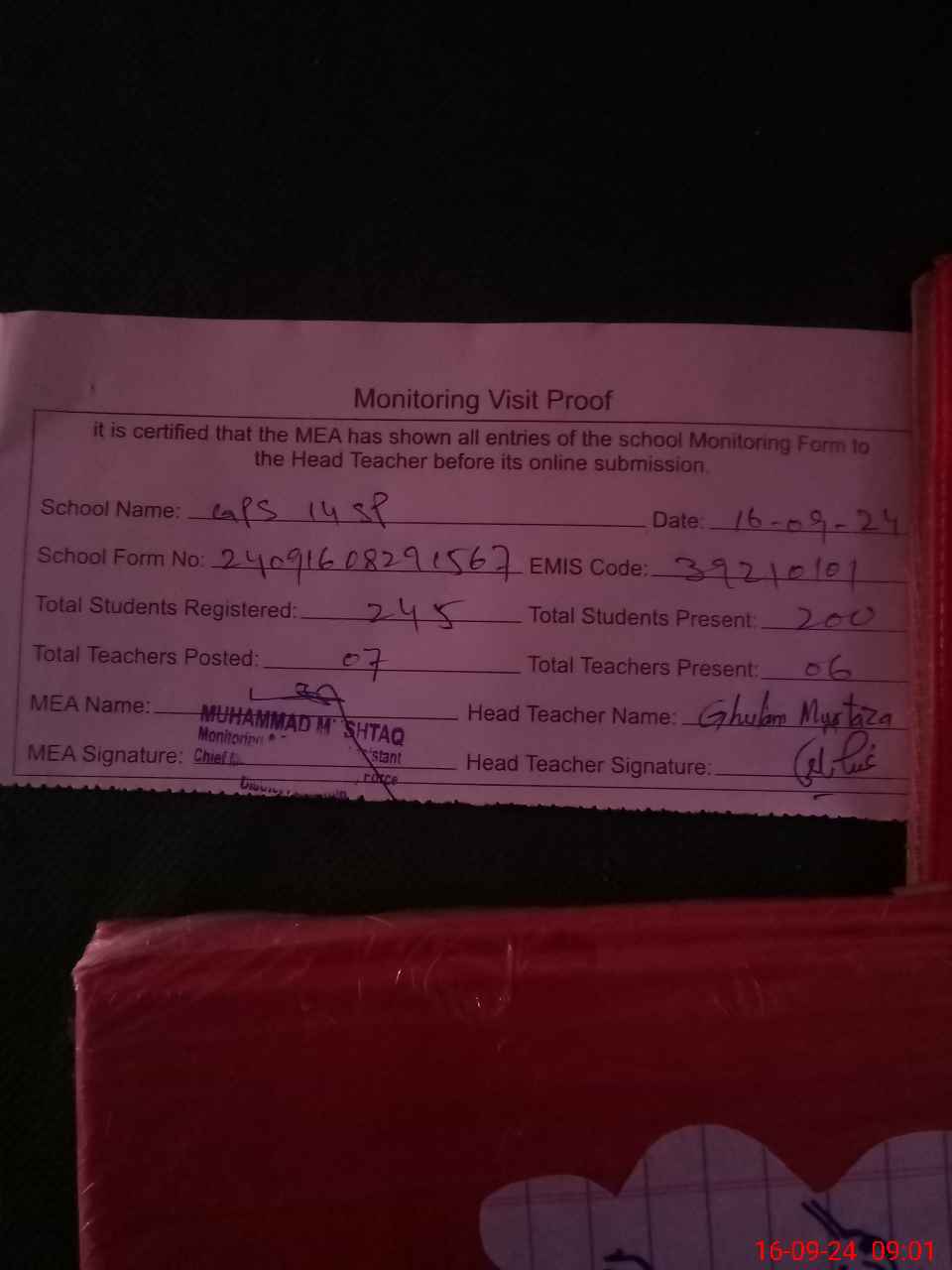| Attendance Register | Head Teacher | MEA with School | Visit Proof |
