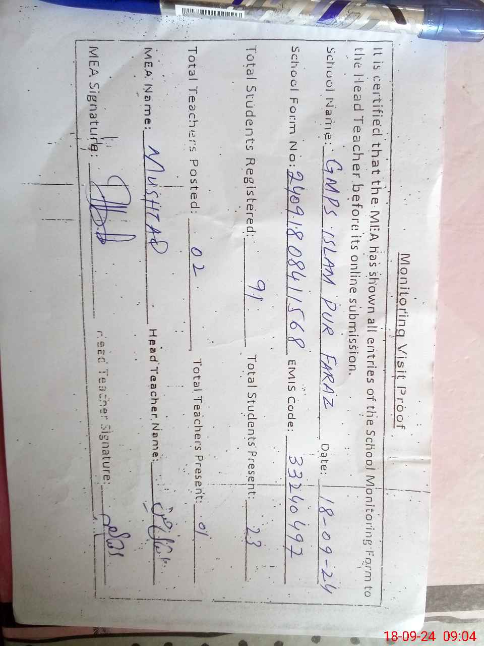| Attendance Register | Head Teacher | MEA with School | Visit Proof |
