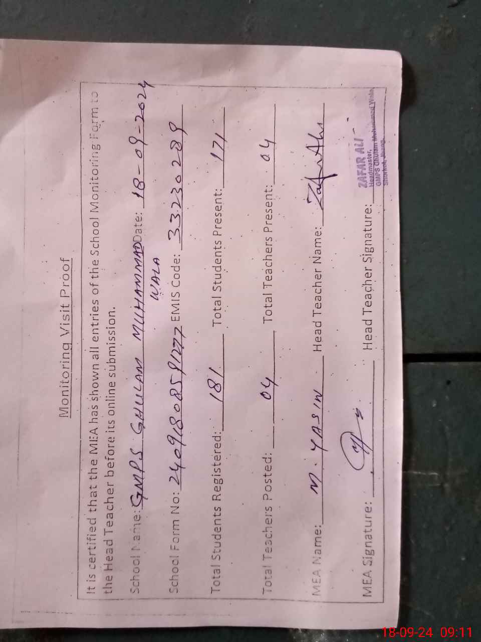 | EMIS Code: 33230289 | Name of School: GMPS GHULAM MUHAMMAD WALA | |||
