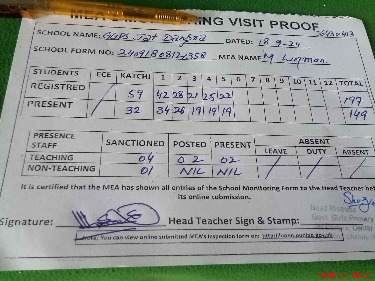 | Attendance Register | Head Teacher | MEA with School | Visit Proof |