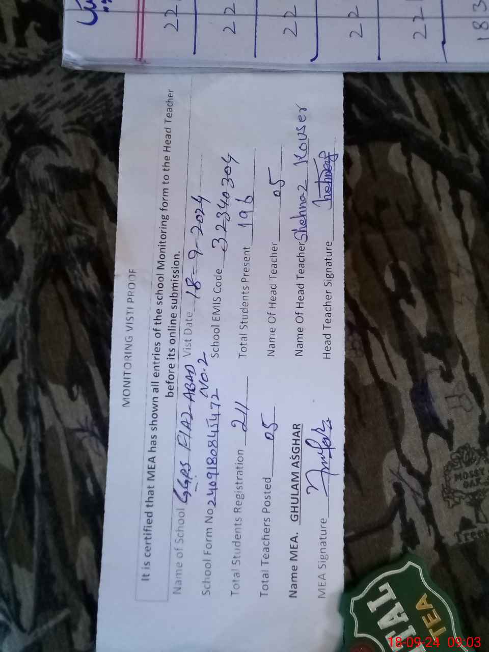 | Attendance Register | Head Teacher | MEA with School | Visit Proof |