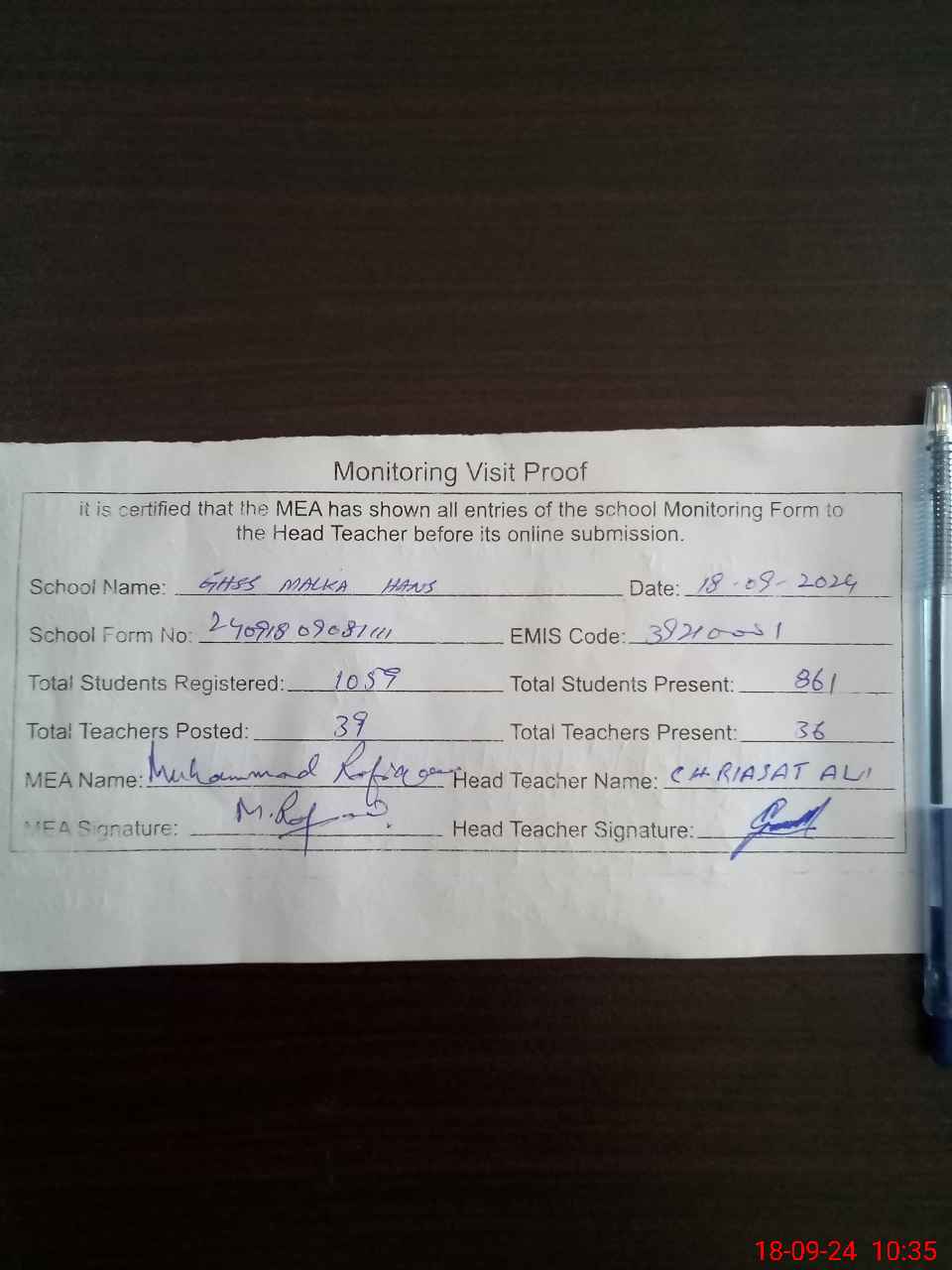 | Attendance Register | Head Teacher | MEA with School | Visit Proof |