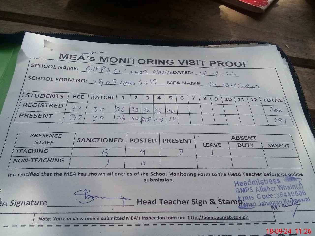 | Attendance Register | Head Teacher | MEA with School | Visit Proof |