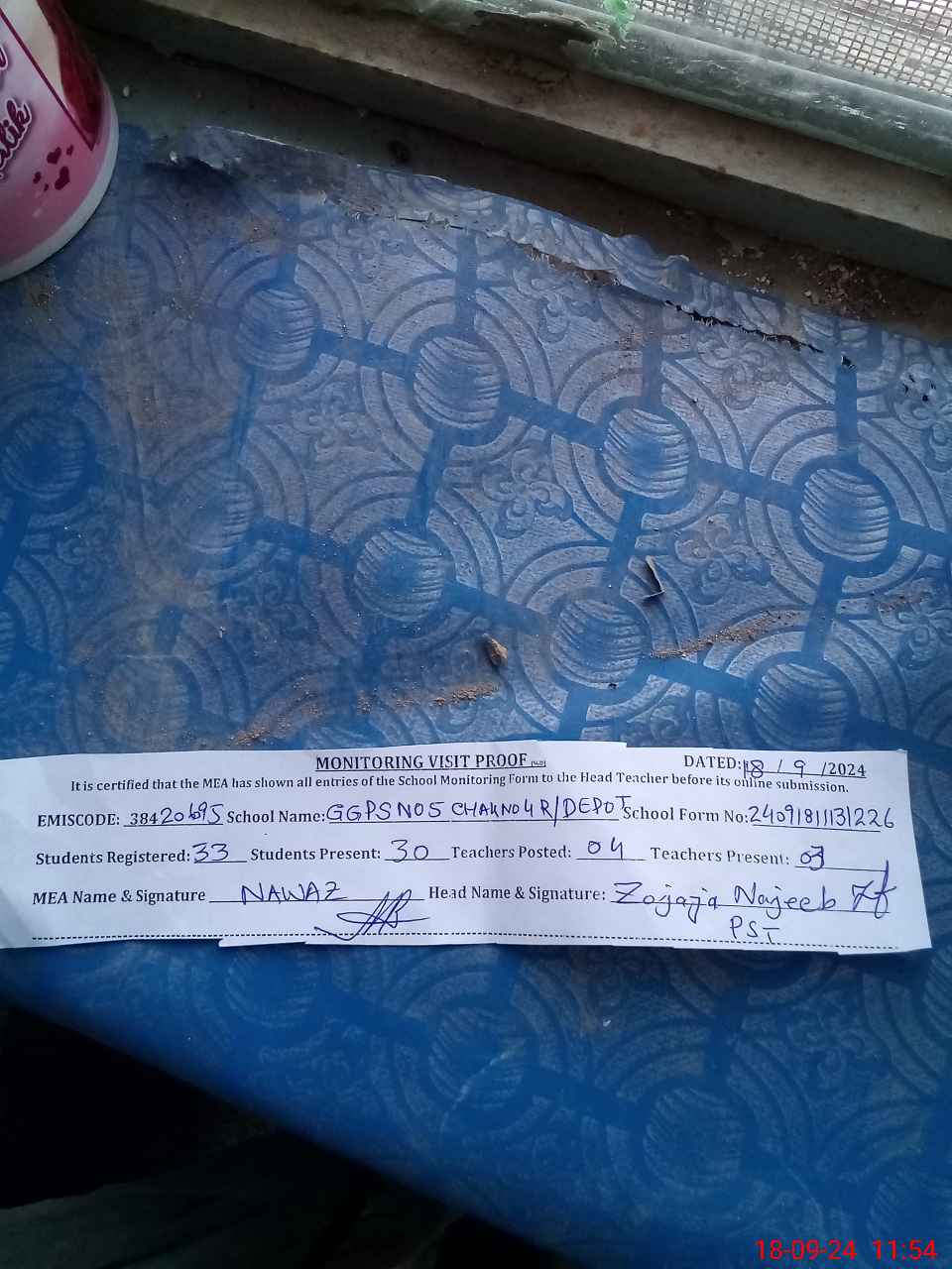 | Attendance Register | Head Teacher | MEA with School | Visit Proof |