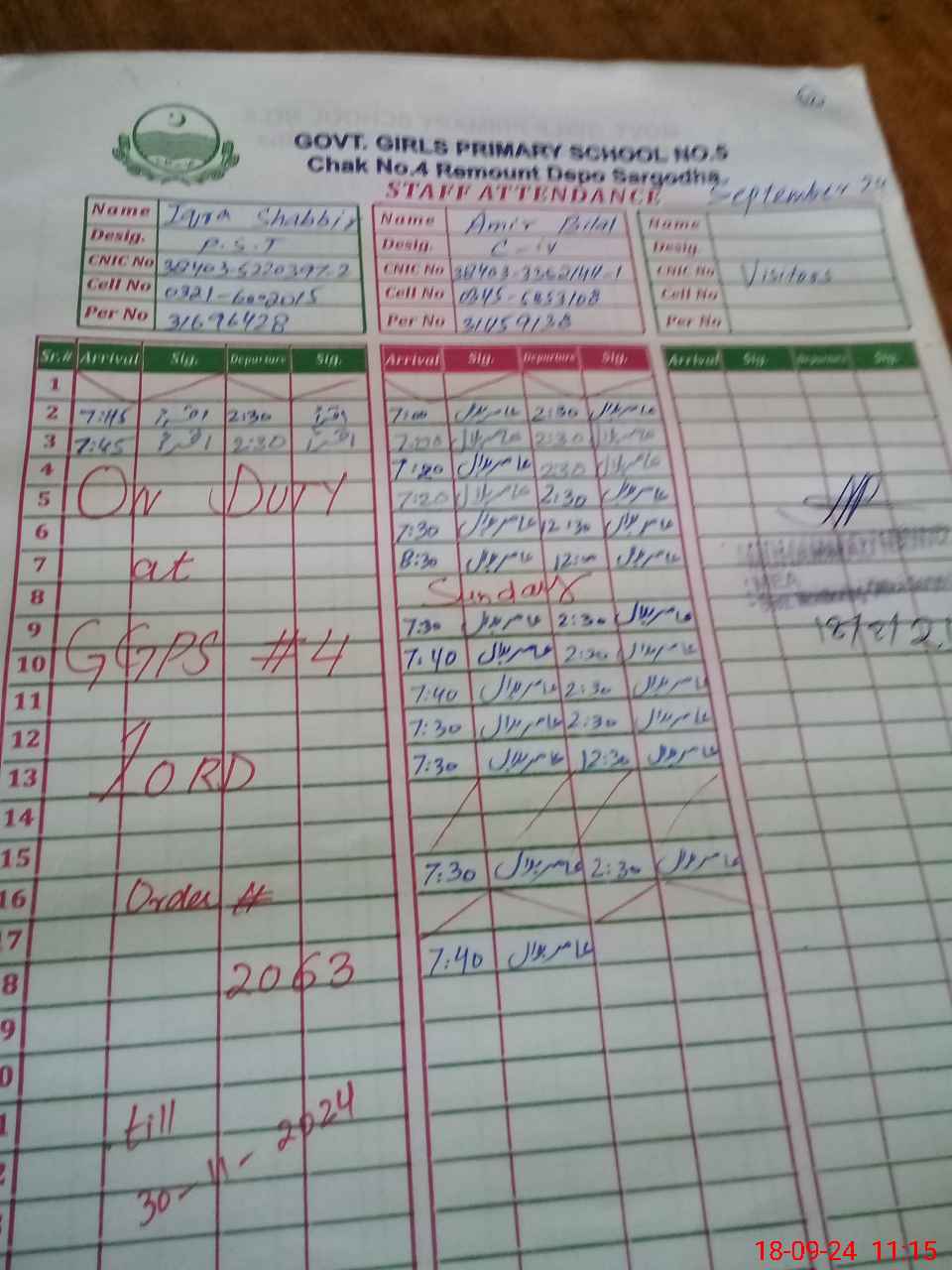 | CNIC | Full Name | Designation | R/C | Absence During Last Calender Month |