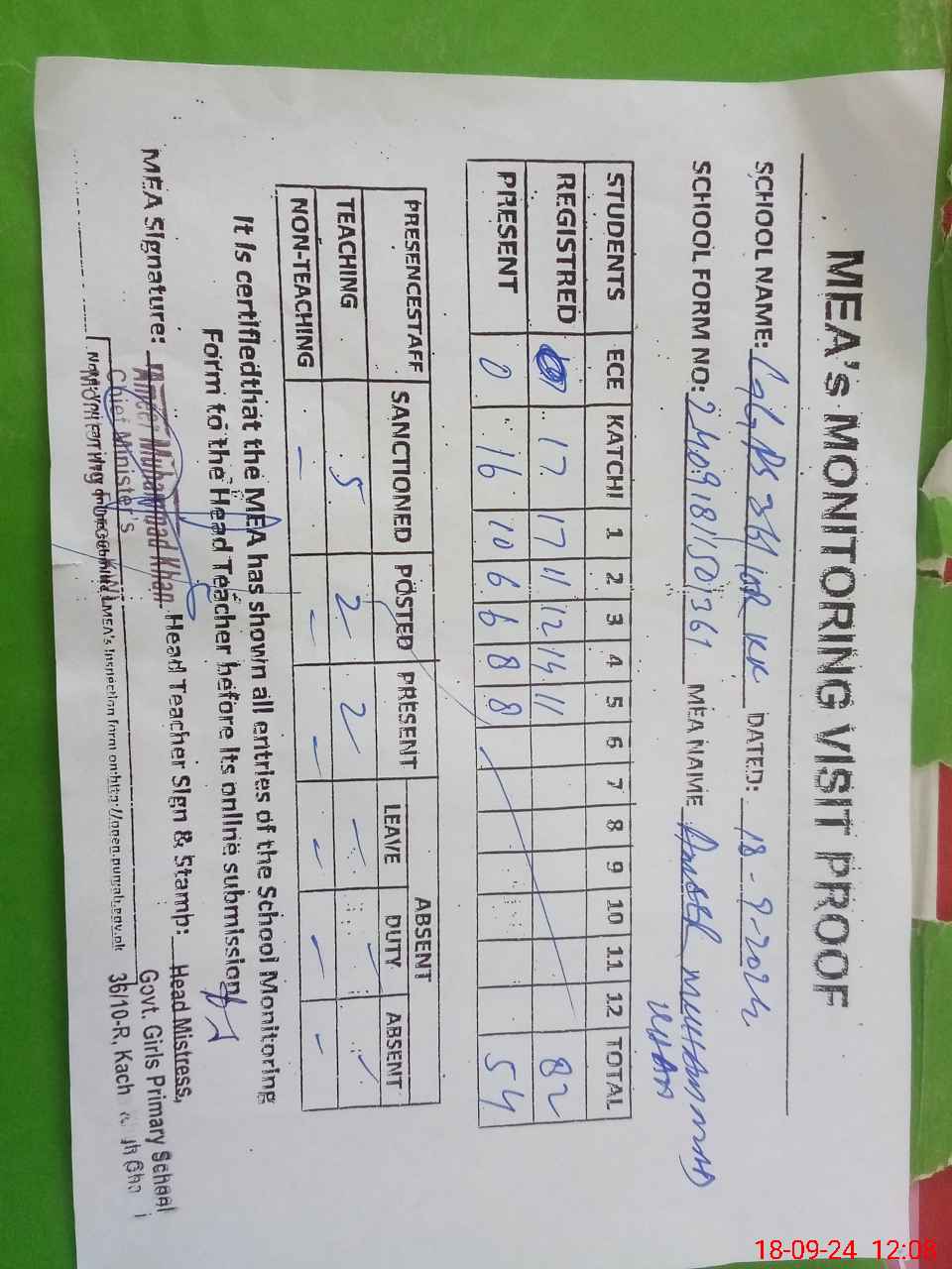 | Attendance Register | Head Teacher | MEA with School | Visit Proof |